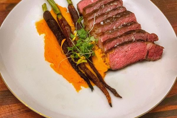 A masterpiece of precision. Prime beef steak cooked sous-vide to a perfect edge-to-edge medium-rare, then finished with a brief high-heat sear for a delicate crust. It is accompanied by a bold, house-smoked red wine and cranberry reduction that balances deep tannins with bright acidity. Served with a whole heritage carrot, caramelized in brown butter until fondant-tender.