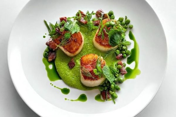 A masterful composition featuring pan-seared hand-dived scallops, finished with a delicate veil of smoky bacon dust. Accompanied by tender white asparagus spears poached in cultured butter and crowned with the refined salinity of pike caviar. The dish is brought together with a light citrus-infused emulsion and micro-herbs.