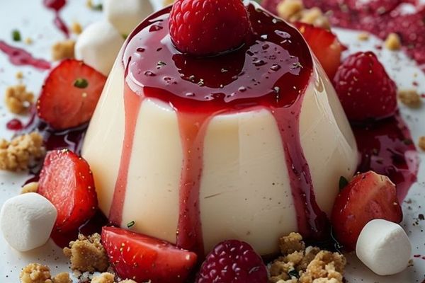 A delicate, silken Panna Cotta infused with rare Madagascan vanilla beans, offering a sublime creamy texture. It is elegantly presented with a vibrant medley of seasonal summer fruits – think ripe raspberries, blueberries, and fragrant peach segments – all complemented by a light, buttery almond crumble for a delightful textural counterpoint. A perfect harmony of flavour and finesse.