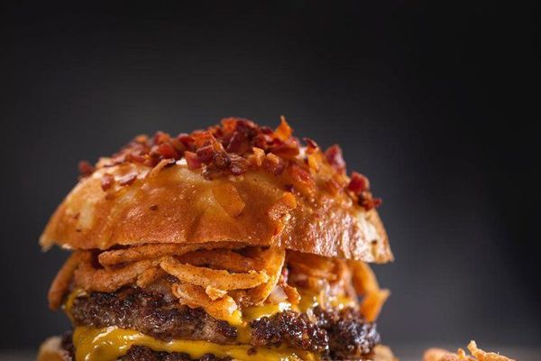 A juicy mini smash burger featuring a thin, crispy-edged beef patty topped with melted cheese, caramelized onions, and crunchy bacon.